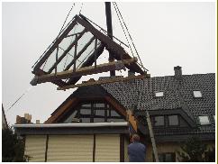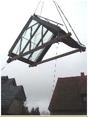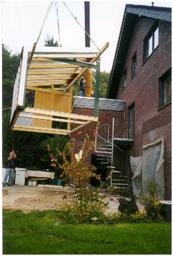 Durch modernste Fertigungsmethoden lässt sich viel Geld sparen. Komplette Vormontage des Wintergartens im Betrieb, also wetterunabhängig. Verladung und Transport mit einem Tieflader. Ein Kran bringt den Wintergarten punktgenau an den vorbereiteten Platz. Endmontage erfolgt an einem Tag (statt wochenlanger Baustelle am Haus). Es folgen noch 2- 3 Tage Dichtungsarbeiten, dann ist Endabnahme
